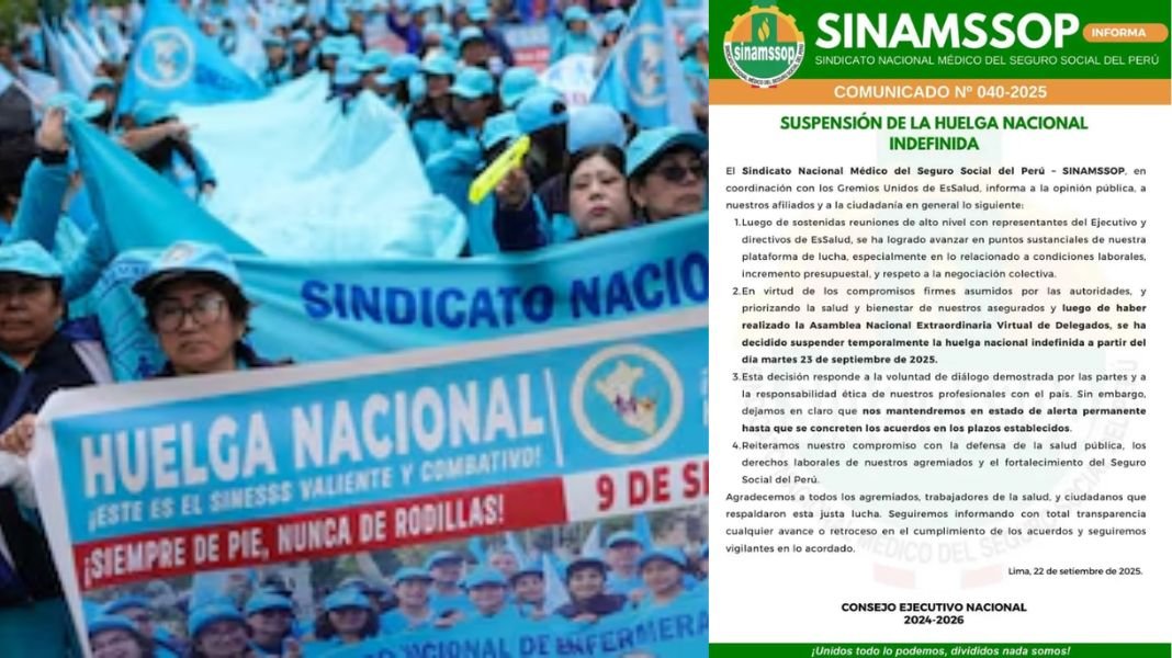 El Sindicato Nacional Médico del Seguro Social del Perú (Sinamssop) anunció que la huelga nacional indefinida, iniciada el 9 de septiembre, quedará en suspenso a partir del 23 de septiembre.