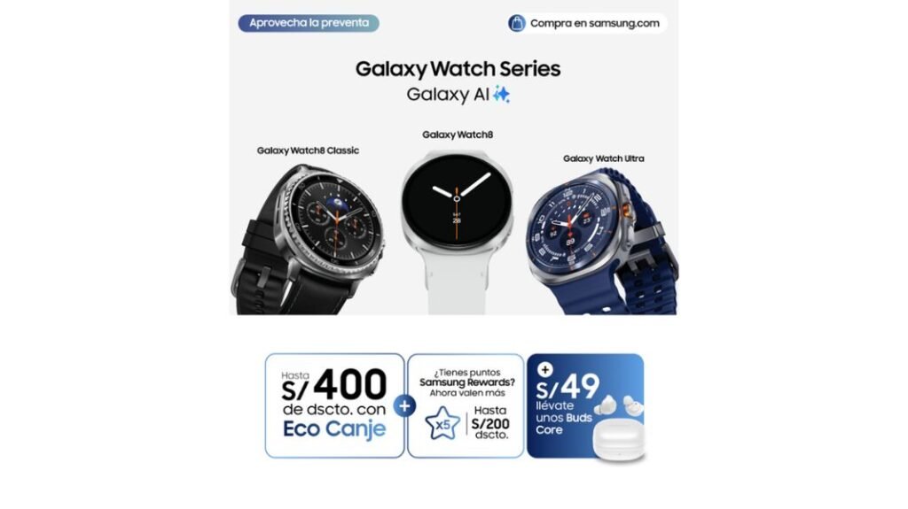 La preventa de la nueva serie Galaxy Watch ya se encuentra disponible a través de la App Samsung Shop hasta el 21 de agosto y cuenta con un beneficio exclusivo del 5% de descuento adicional para quienes se registren por primera vez, además, los usuarios pueden acceder a S/250 de descuento adicional aplicando EcoCanje, o hasta S/ 400 en el caso del Galaxy Watch Ultra (2025), y disfrutar de envío gratuito.